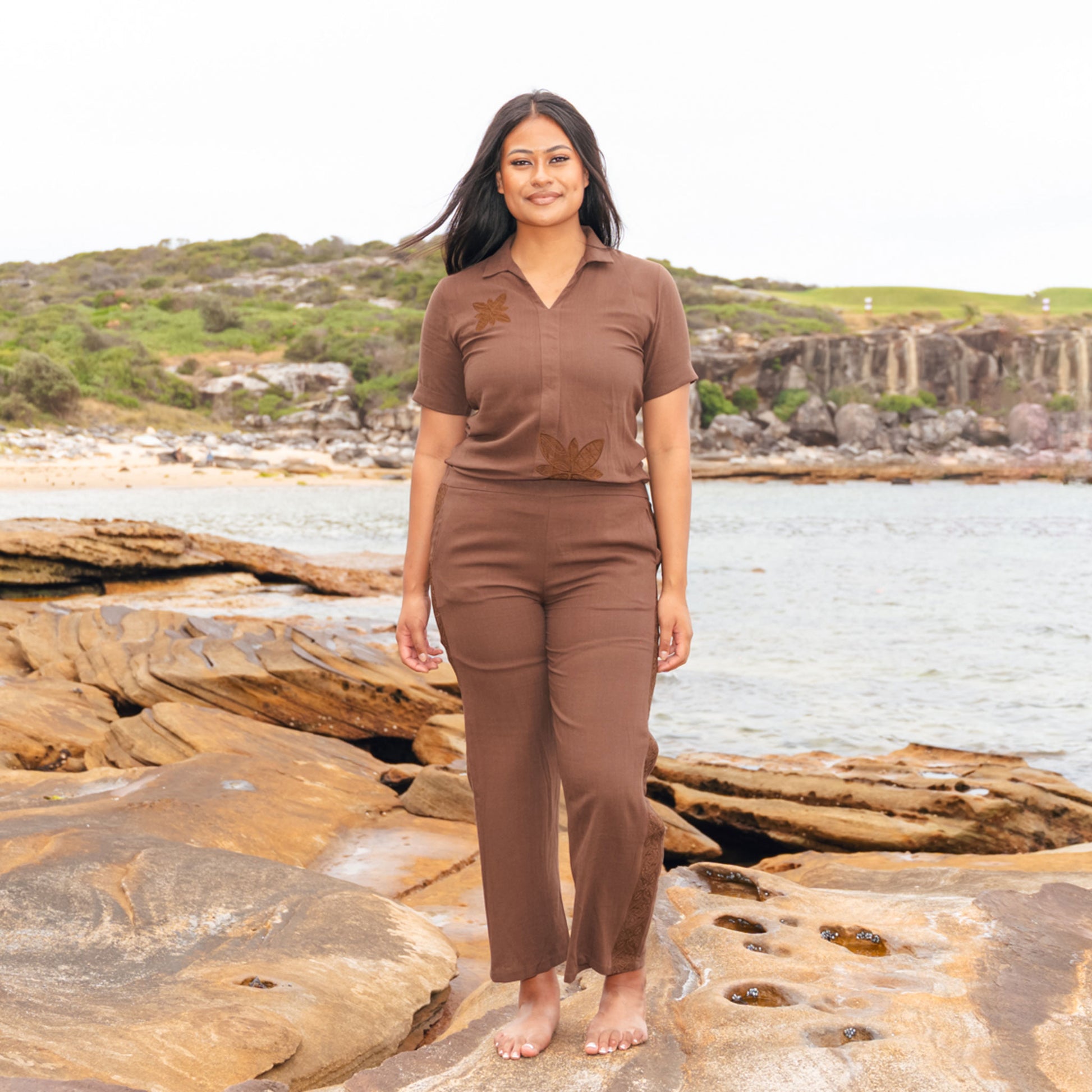 The Savusavu Shirt is a bold and modern women’s island-inspired shirt designed with striking Polynesian cultural details. This button-free design features two embroidered patches with authentic Polynesian tattoo artwork, creating a unique and powerful visual statement. Made from a lightweight and breathable viscose-linen blend, it delivers natural comfort and effortless style for warm days. Available in classic White, Navy, and Brown, the Savusavu Shirt is perfect for those who love contemporary fashion rooted in Polynesian heritage.