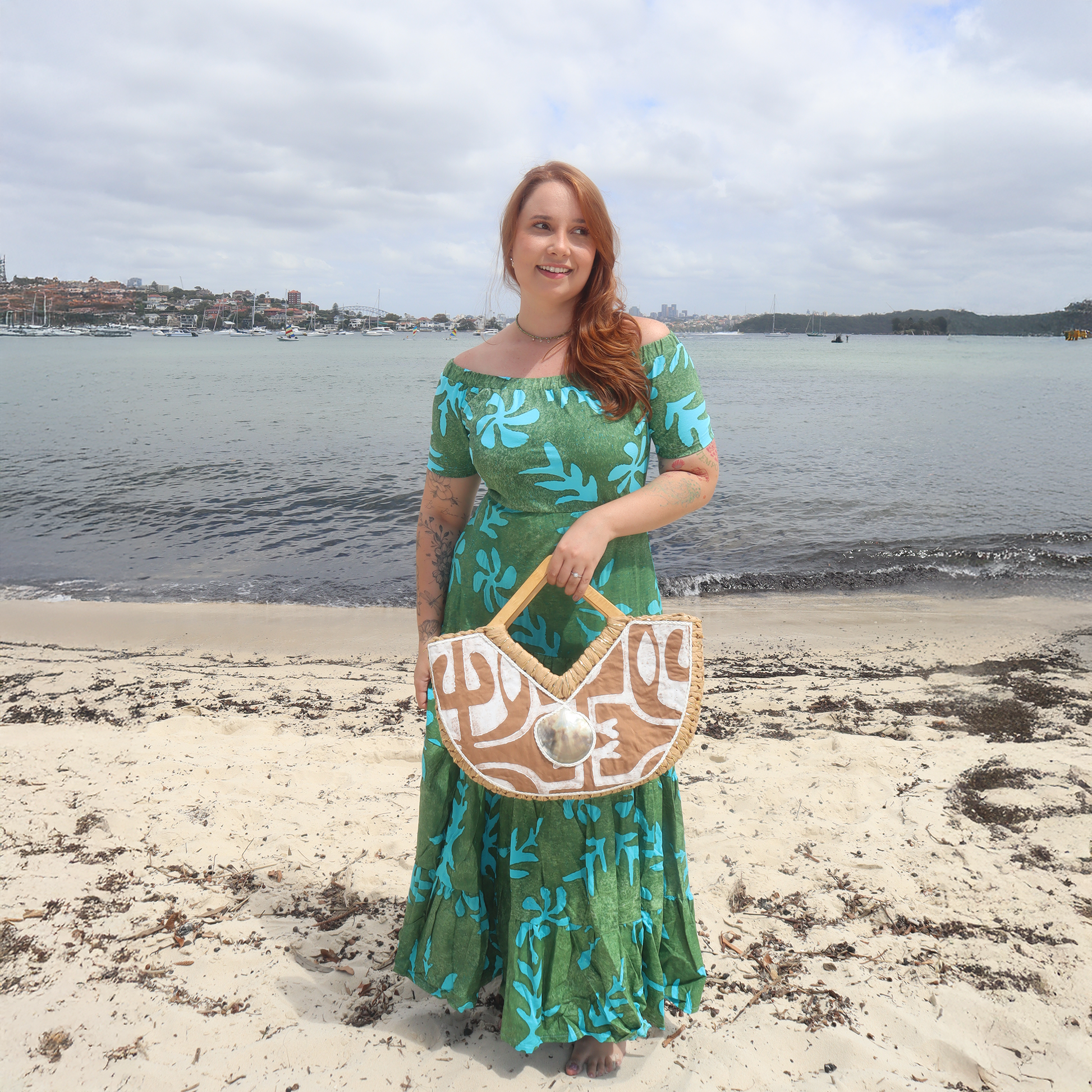 This long, off-the-shoulder dress features an elasticated waist that gently defines the figure while allowing a relaxed, flattering fit. Finished with hand-painted artwork, each piece is unique and carries the expressive spirit of Pacific Island artistry.